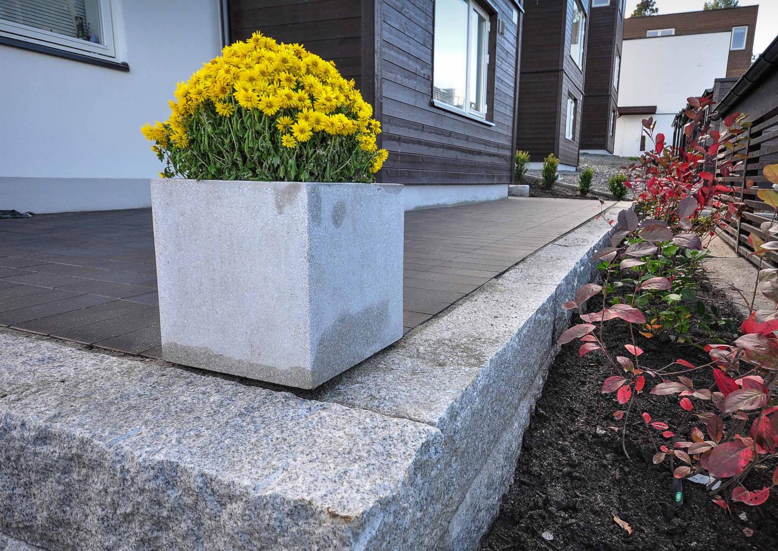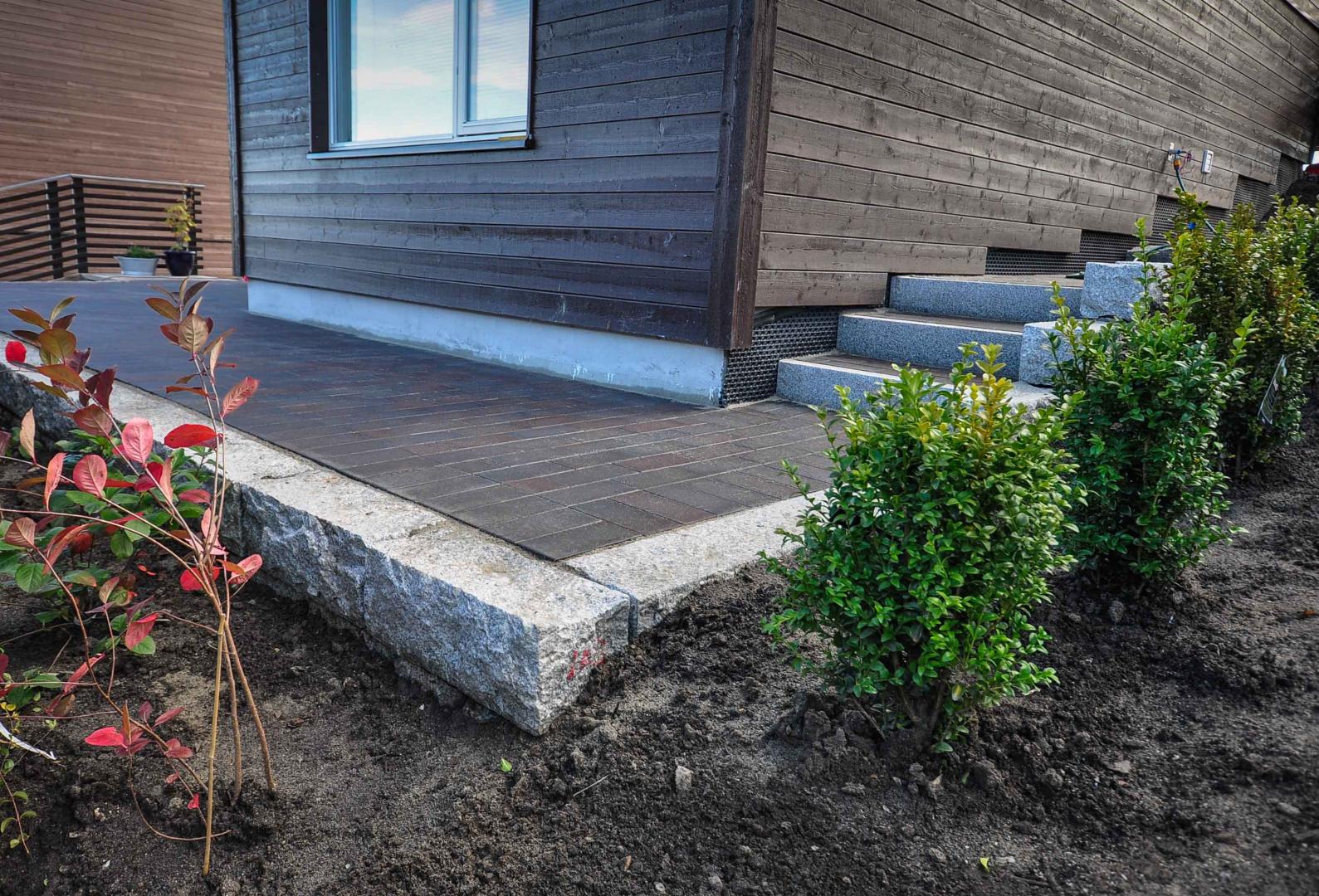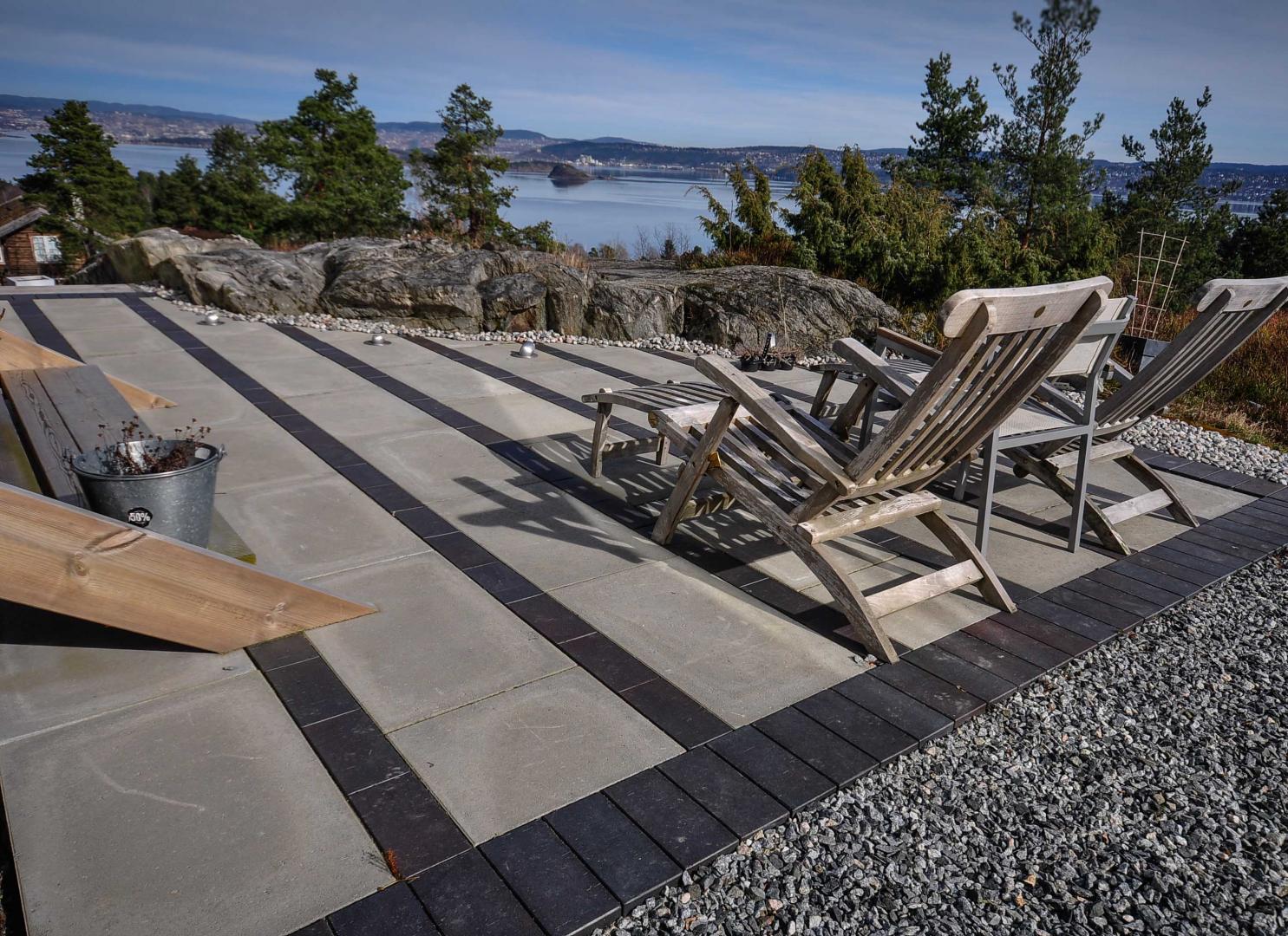 Vi ble engasjert for å skape et funksjonelt uterom rundt en ny bolig på fantastiske Nesodden. Etter at alle grunnarbeidene var utført måtte tunge gangbaneheller fra Asak fraktes med en hjullaster til en terrasse bak huset. Murene ble utført i 20x20 granittblokker. Som belegg ble det brukt marktegl type Terca Bretagne fra Wienerbeurger. Kombinasjon av alle materialene skapte en tidløs og stram hage. Prosjektet ble tegnet av Denging Hagedesign As.